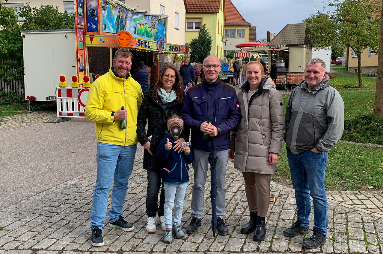 Mitgefeiert haben auch unser 1. Bürgermeister Dieter Lenzer (Mitte) sowie Stadtrat Jürgen Adler, Elisa Schneider, Dominice Weiglein und Stadtrat Alexander Hansch (von links). Auf dem Wagen mit den Musikern war 2. Bürgermeister Hans Brummer am Baritonhorn im Einsatz.